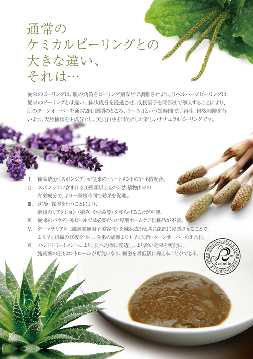 通常のケミカルピーリングとの大きな違い、それは…従来のピーリングは、肌の角質をピーリング剤などで剥離させます。リベルハーブピーリングは従来のピーリングとは違い、棘状成分を浸透させ、成長因子を深部まで導入することにより、肌のターンオーバーを通常28日周期のところ、3〜5日という短時間で肌再生・自然剥離を行います。天然成分を主成分とし、美肌再生を目的とした新しいナチュラルピーリングです。