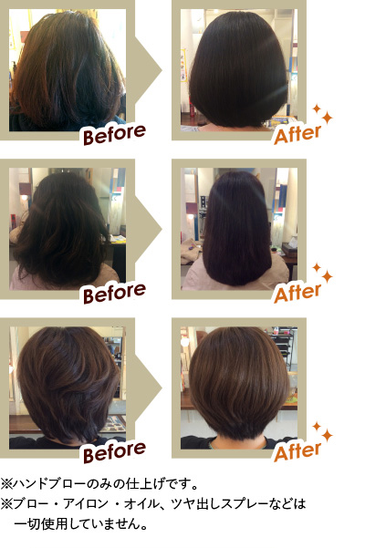 「髪をまっすぐにする」ことが大切なのではなく、「髪を傷めない」ことが大切。 毛髪内部の欠損している部分を補給しながら、髪そのものを内側から 美しく整った状態にすることで、髪本来のツヤと輝きを取り戻し、 大人の女性が求めるストレート感に仕上げます。 |